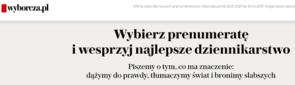 Gazeta zachęca do prenumeraty "Tłumaczymy świat i bronimy słabszych". Może jednak uciekać się pod inną obronę, szczególnie od mądrości Gazety Wstecznej i Wszetecznej? Przecież stosowanie się do ich zaleceń oprócz publicznych manifestacji głupoty może prowadzić do aktów desperacji zakończonych masowymi samobójstwami.